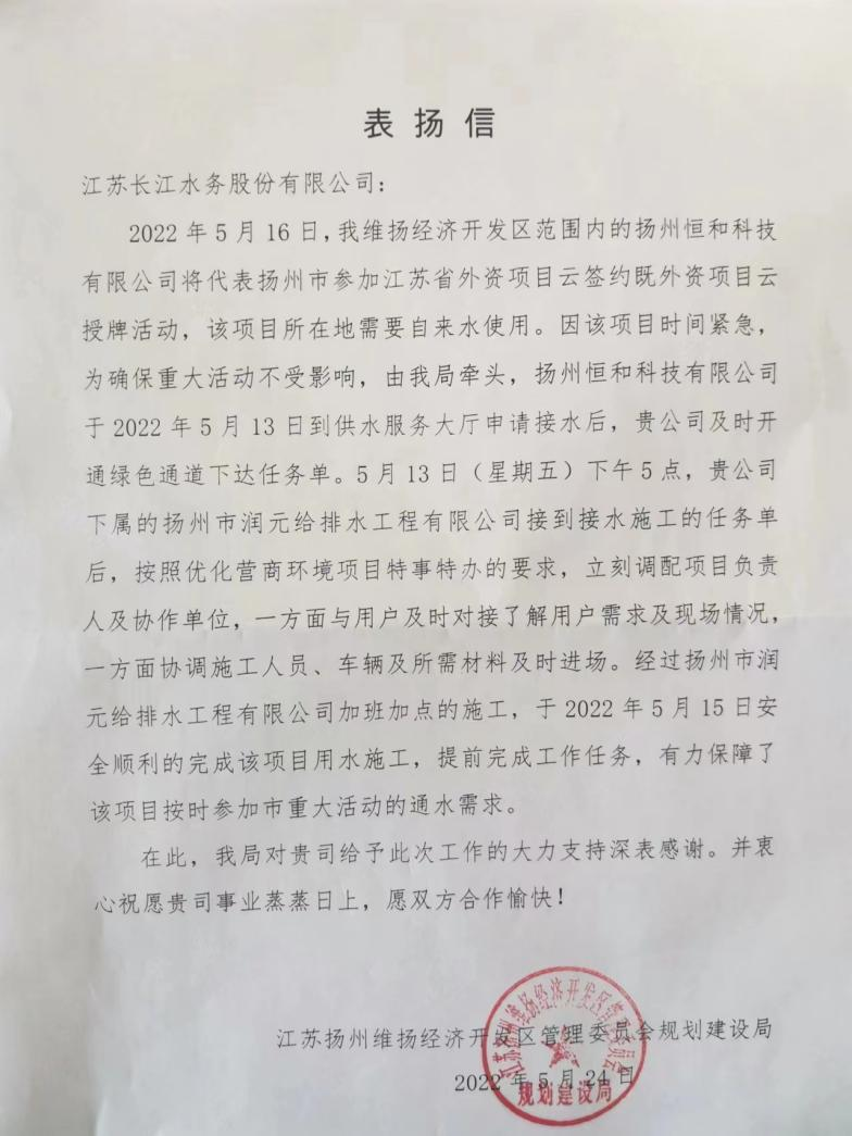 5月30日下午,扬州市维扬经济开发区住建局代表向长江水务公司送来一封感谢信,高度赞扬长江水务润元公司以大局为重,担当在先,优化营商环境,快速优质提供供水施工服务。