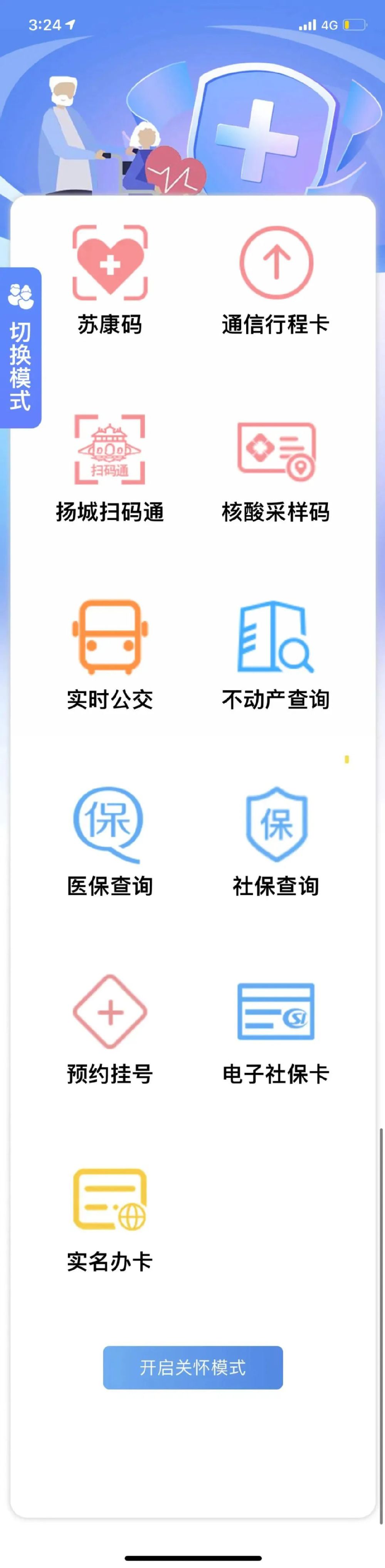 老年人通过手机使用“我的扬州APP”,切换到关怀模式首页页面,不但可以转换成大字体、大图标的模式,而且首页页面集成了经常使用的苏康码、核酸采样码、医保查询、预约挂号等11项高频应用。7月19日上午,云上扬州推进工作领导小组办公室、扬州市民卡有限责任公司举行新闻发布会,介绍“我的扬州APP”关怀模式情况。