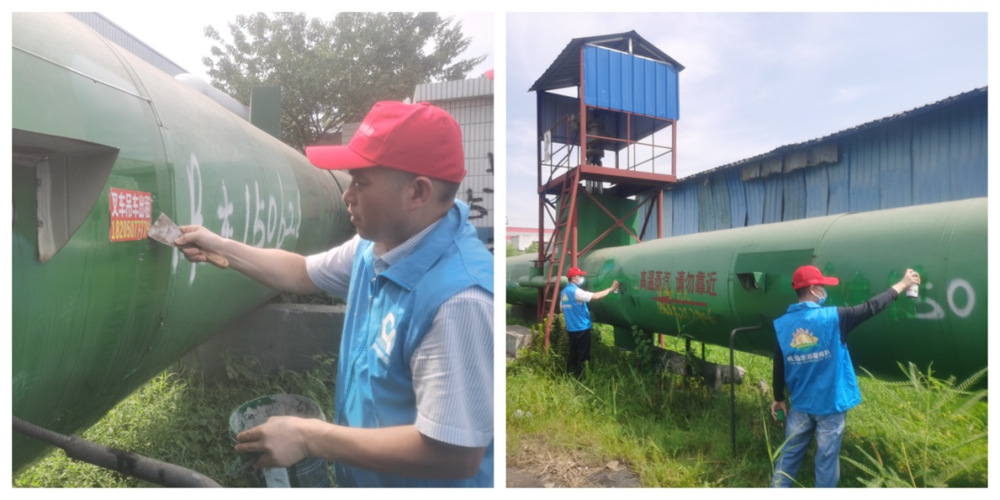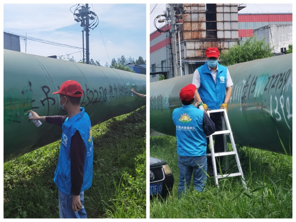 此次活动共22名志愿者参加,集中整治古渡路南段扬二线DN800大口径管道上的“乱贴乱涂”现象。伴随着烈日骄阳,大家热情高涨,活动现场呈现一片热火朝天、干劲十足的景象。一组志愿者在乱贴乱画的地方,把广告贴纸喷湿后,再拿清理专用铲仔仔细细地清理,大家配合默契,“洗、递、擦”一气呵成。另一组志愿者对管道上喷涂广告进行覆盖清除,站在架扶梯上,闻着刺鼻的油漆味,对管道外壳上的喷涂广告进行再喷涂覆盖,他们额头、脸上、嘴边布满细密的汗珠。