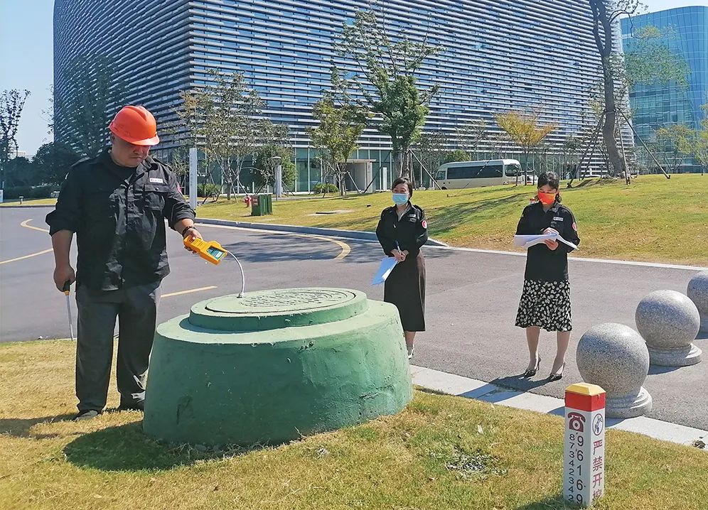 检查组来到扬州运河大剧院,根据巡线员石荣祥当天工作量,随机抽查了该区域的窨井、调压柜等点位,查看了调压器栅栏上有无灰尘。检查组强调,运河大剧院是城市地标,不仅要尽心尽责地按照规范巡查,保障燃气设施安全,也要维护好燃气设施的清洁状况,树立扬州中燃良好形象。