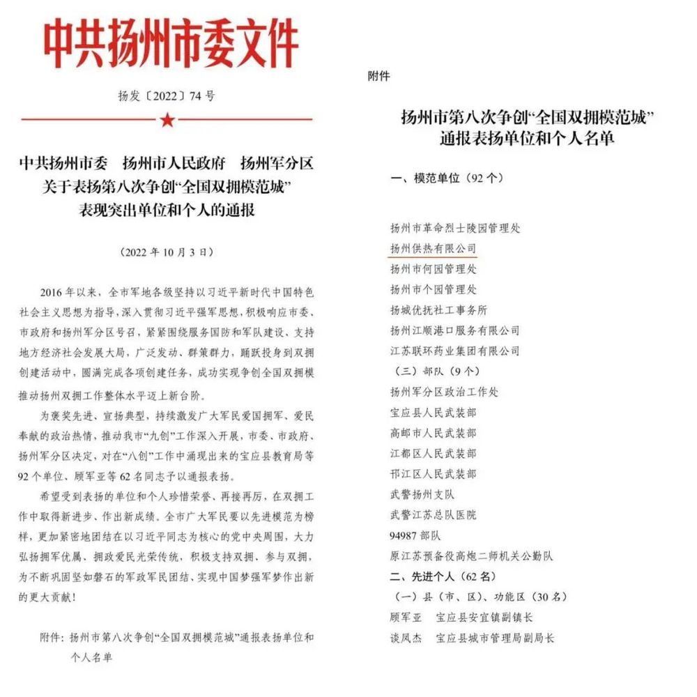 近日,扬州市市委、市政府、军分区印发表彰决定,扬州供热有限公司荣获第八次争创“全国双拥模范城”表现突出单位。供热公司始终把双拥工作当作新时期凝聚军心民心、加快经济发展的一项重要工作来落实,求真务实,开拓创新,为我市成功实现争创全国双拥模范城“八连冠”目标奠定了坚实的基础。