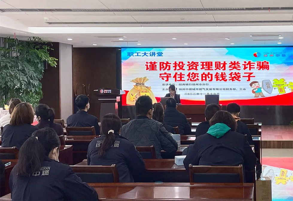 为进一步增强干部员工法治意识和识骗防骗能力,2022年11月16日下午,扬州中燃公司联合招商银行扬州分行开展“谨防投资理财类诈骗”主题普法宣讲活动。