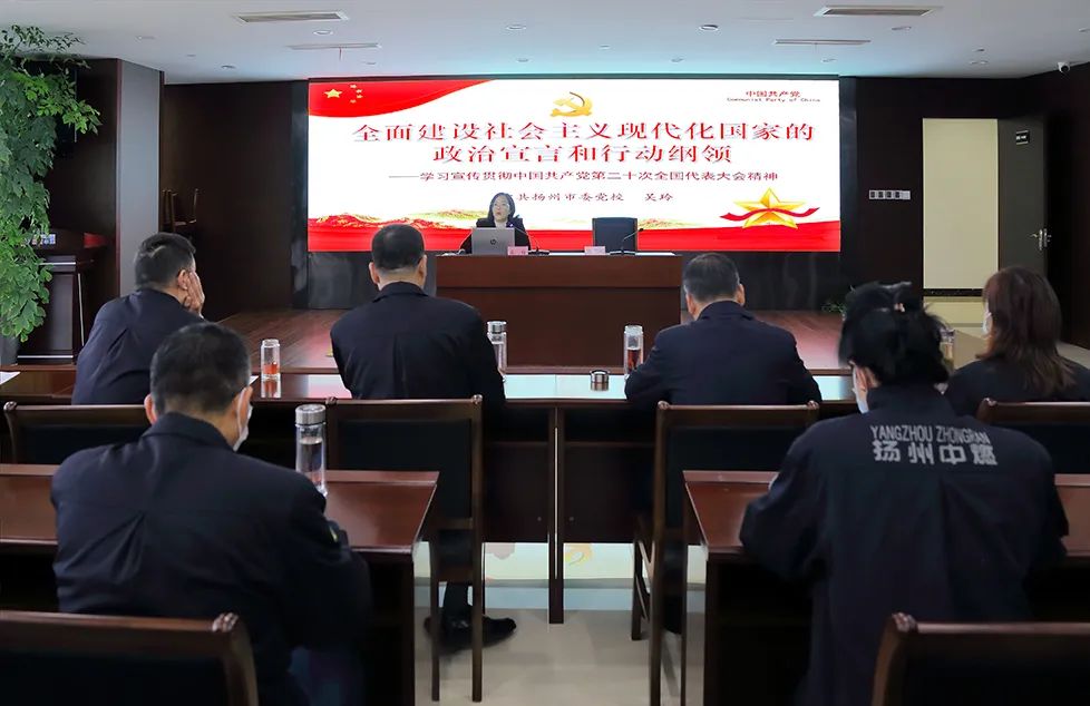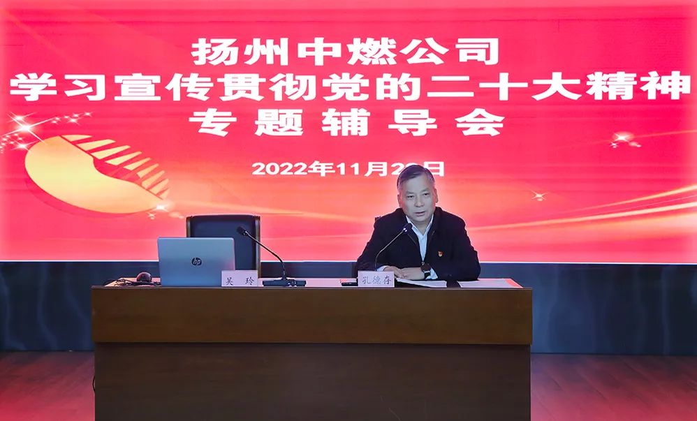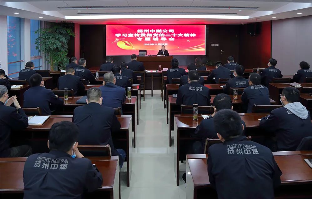 为深入学习宣传贯彻党的二十大精神,把扬州中燃公司广大党员、干部员工的思想统一到党的二十大精神上来,把力量凝聚到推动扬州中燃公司转型跨越发展的方向上来,2022年11月22日下午,扬州中燃公司党委组织开展学习宣传贯彻党的二十大精神专题辅导会。会议传达学习了《中共中央关于认真学习宣传贯彻党的二十大精神的决定》,对全公司学习宣贯党的二十大精神进行动员部署,邀请市委党校吴玲老师宣讲党的二十大精神。公司领导班子成员,全体中层干部参加会议。