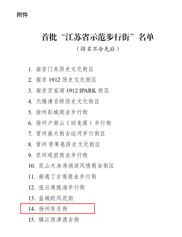 近日,江苏省商务厅发布《省商务厅关于公布首批“江苏省示范步行街”名单的通知》,确认扬州东关街等15条步行街为首批“江苏省示范步行街”。