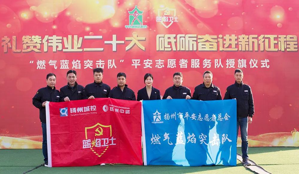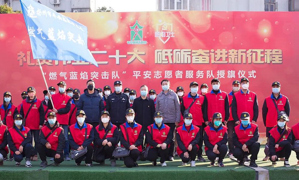 为贯彻党的二十大精神,筑牢燃气安全防线,为建设平安扬州夯实基础,12月15日,扬州市平安志愿者总会、扬州中燃公司在邗上街道武塘社区中心广场,共同组织开展“礼赞伟业二十大、砥砺奋进新征程”平安志愿服务活动暨“燃气蓝焰突击队”授旗仪式。扬州市公安局二级高级警长、扬州平安志愿者总会副会长俞洪出席活动,为“燃气蓝焰突击队”平安志愿服务队授旗。扬州中燃公司党委书记、董事长,燃气安检员代表参加活动。