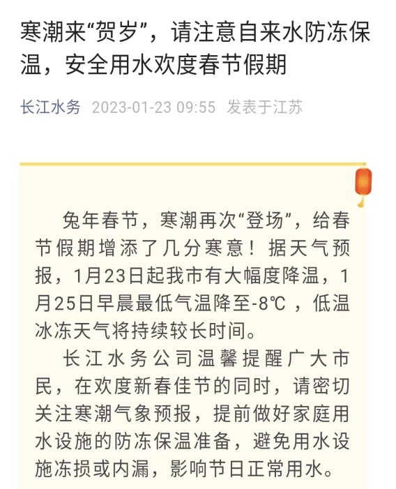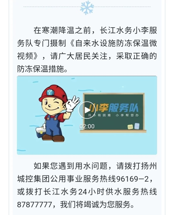 兔年春节假期我市遭遇持续寒潮天气,有严重冰冻,为保证市民用户正常用水,长江水务一方面通过媒体、微信公众号等平台密集发布寒潮预警,提前宣传水表水管防冻保温方法,另一方面由抄表员在各社区群、业主群里发送防冻提醒,特别提醒离扬的市民在出门前关阀排空防冻,做好防冻保温准备。长江水务“小李服务队”加强春节值班值守,奔赴各居民小区,积极为居民提供维修服务。