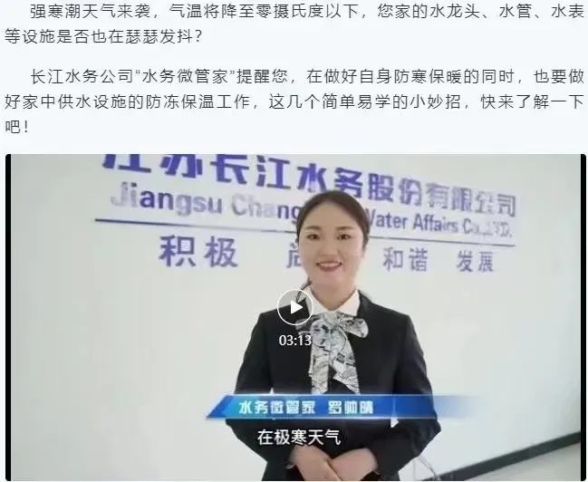 “水务微管家”开通企业微信平台,摄制多条微视频,推送供水服务咨询,普及自来水知识,与重点用水企业实现“一对一”线上线下联动服务。在寒潮降温前,通过企业微信平台、社区网格、志愿者服务微信群密集发布冬季自来水防冻提醒,上门为老年用户和弱势群体做好冬季用水设施的防冻保温措施。