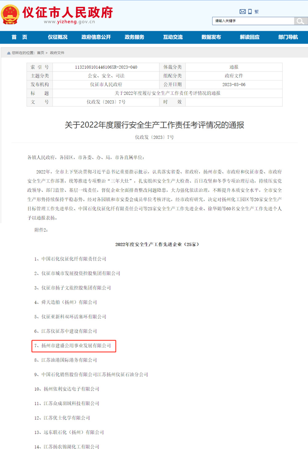 近日,仪征市人民政府通报了2022年度履行安全生产工作责任考评情况,建盛公司荣获2022年度安全生产工作先进企业。