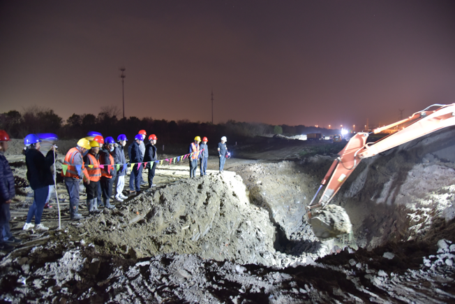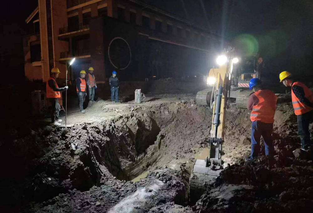 公司领导在施工现场靠前指挥,润元公司、抢维修中心施工人员提前进场,采用挖掘机等大型机械打开作业坑,及时开挖好管道沟槽,备好管件材料,并做好管道改移的其他各项准备。28日晚8点,闸门关闭,经过4小时泄压、排水后,4处碰接点同时作业。挖掘机的轰鸣声此起彼伏,施工人员有序地忙碌着,阳春三月乍暖还寒,施工人员不顾寒冷刺骨的水流迅速进入作业坑中,对旧管道进行切割,随后打通新设铺管道并焊接闷板,此时已是深夜,施工人员为了尽早恢复供水,他们挑灯夜战、攻坚克难、争分夺秒,始终以饱满的工作热情坚守在施工一线。