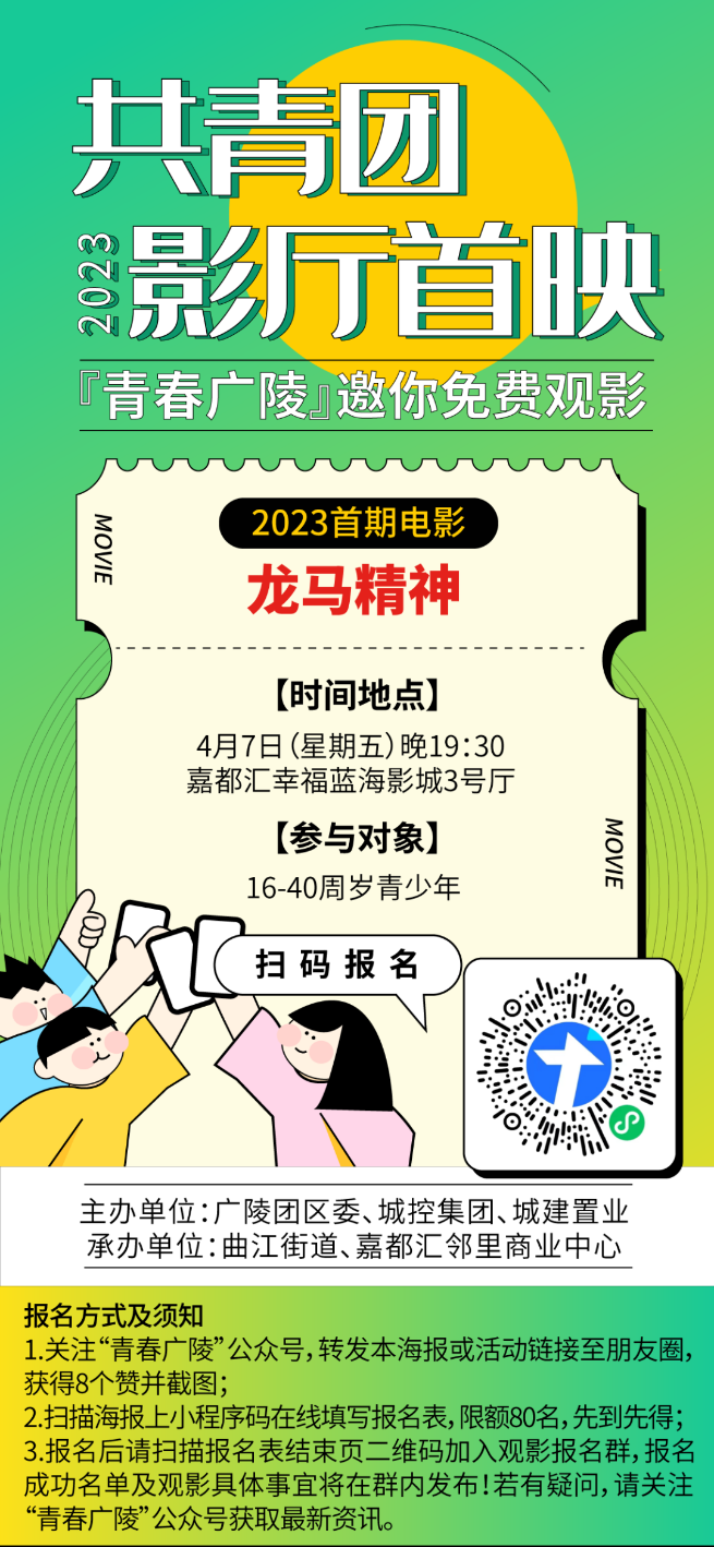4月7日星期五晚7点半,嘉都汇幸福蓝海影城“共青团影厅”将开展首映观影活动,邀请共青团员、少先队员、团干部、志愿者等优秀青少年群体参加。