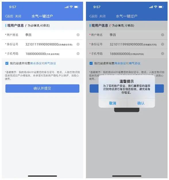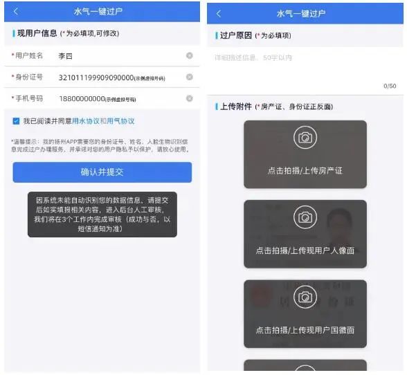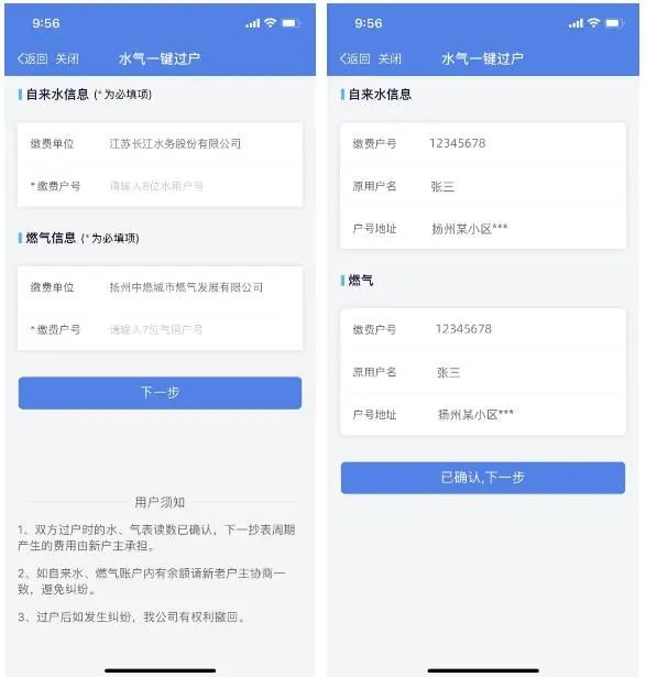用户只需通过“我的扬州APP”,一次性提交水气户号,与新户主相关身份信息,即可在线办理水气过户,整个过程高效便捷,一气呵成,秒速办理。