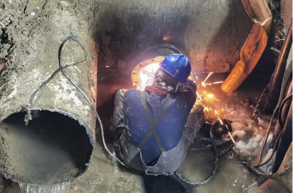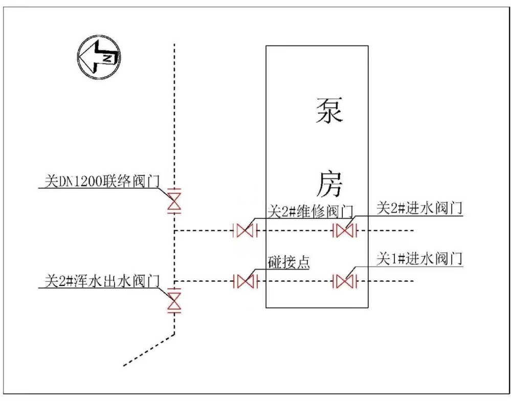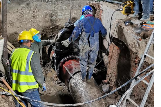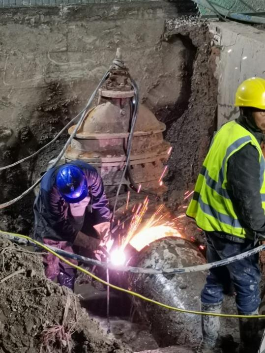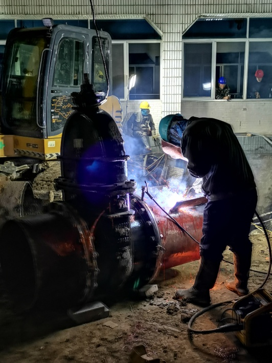 因考虑到本次更换工作作业面小,施工条件差,阀门老旧,施工时长将直接影响第四水厂自来水生产。4月13日上午,公司领导班子成员、施工项目部负责人查勘现场,完善应急保障预案,充分做好技术交底,模排施工流程,所有人员、设备听令待发,各项准备工作均一一落实落细。下午3点,新装阀门及管件连接、反光隔离栅栏、切割设备等均放置就位,做好管道碰接最后准备。4月13日20点,施工序幕全面拉开。关闭阀门、排水泄压、抽排余水、安装阀门、焊接钢管、开启阀门各部门协同配合,现场人员争分夺秒抢夺进度。