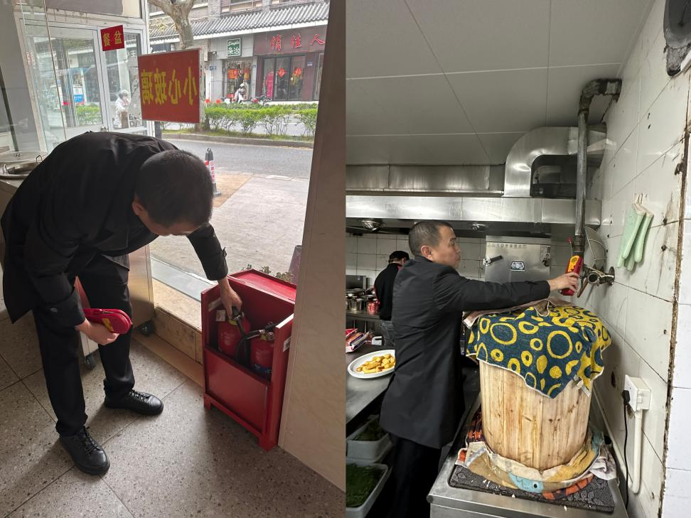 在迅客大食堂,安全员详细查看了店内消防器材、安全疏散通道等,对燃气管道、阀体进行气体泄漏检查,要求餐饮负责人按消防规定配备应急照明灯、灭火器等消防设备,同时提高安全用气防范意识,每日定时对店内燃气设备进行检查,确保安全无泄漏。