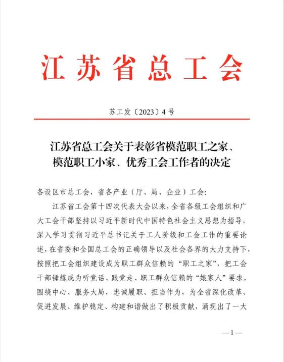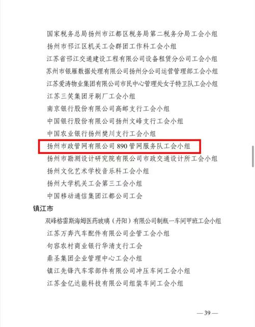 近日,江苏省总工会表彰了一批省模范职工之家、模范职工小家、优秀工会工作者。扬州市政管网有限公司“890管网服务队”荣获“江苏省模范职工小家”称号。