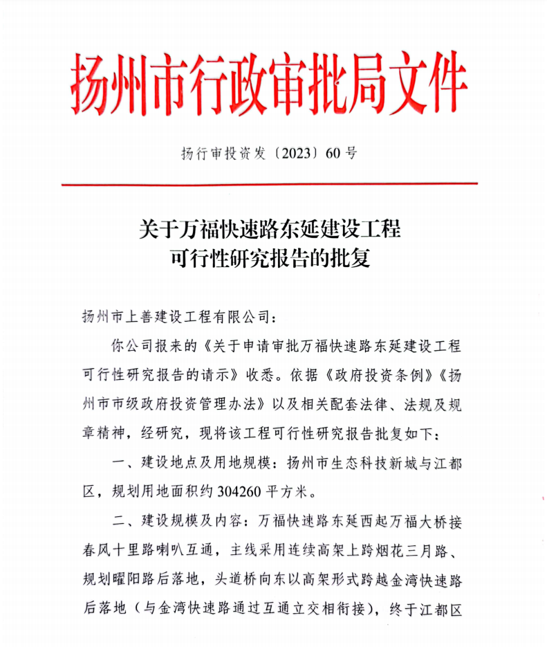 万福快速路东延的规划建设,对完善区域路网布局,促进区域经济协调发展等具有重要意义。下阶段,上善公司将加快推进初步设计、征地等工作,力争早开工、快建设,为“好地方”扬州高质量发展添砖加瓦。