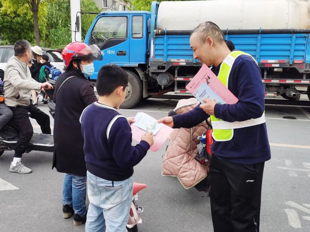 活动中,“蓝焰同心”志愿结合学校周边的道路交通环境,向散学的学生发放宣传资料,做好交通安全知识宣传,同时引导学生们以“小手牵大手”的互动方式,告知父母及亲戚朋友共同遵守道路交通法律法规,守法知礼,安全出行。
