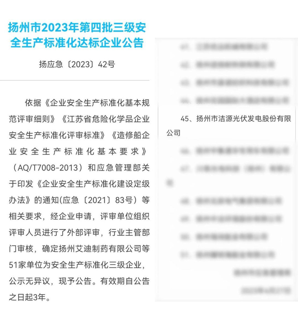 近日,扬州市应急管理局发布公告,确定洁源光伏公司为“安全生产标准化三级企业”。