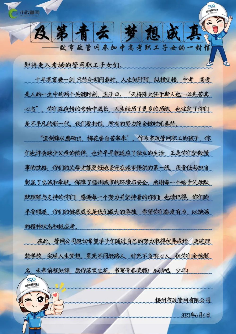 一句句细腻的叮嘱,一声声诚挚的关怀,让职工深深感受到公司的殷殷希望之心和拳拳助考之情。接下来,管网公司将从多角度关爱职工,从职工生活的点滴入手,传递“管网温度”,让大家感受到组织的关怀和温暖,不断增强员工的幸福感和归属感。