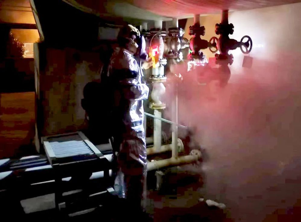 晚上9时,夜间演练正式开始。现场巡查人员发现1#储罐法兰连接处突发泄漏,并报告应急指挥组,应急指挥组立即启动应急处置预案,巡查人员用厚毛巾缠绕泄漏部位,开启喷淋水,确保泄漏点冻结,再向罐内注水,抢修人员穿戴防护装备、携带抢修设备进入现场,对泄漏点进行抢修。随后对储罐进行倒罐作业,在该储罐压力低于0.05MPa后,放散结束后,再进行抢修作业。