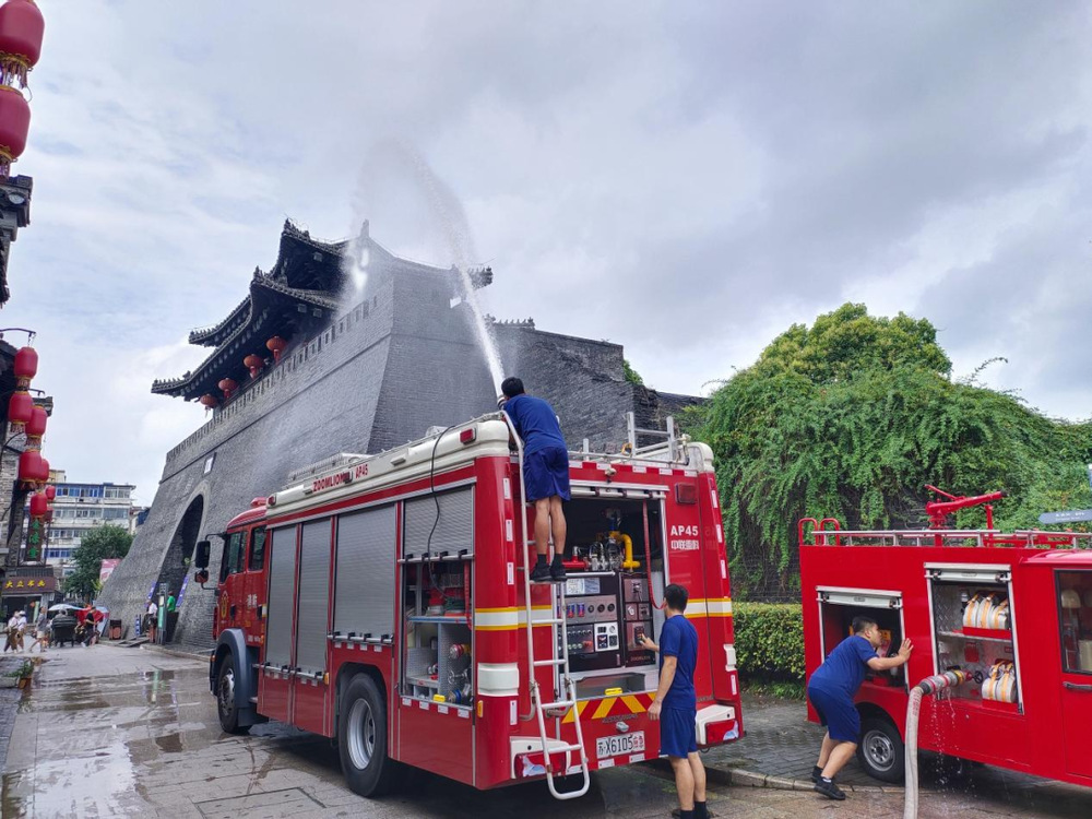 此次演习从实战的角度出发,测算水带干线的铺设距离、水枪阵地设置、力量部署、车辆的位置停靠等信息。演练前,消防员与安保人员再次逐一对消防通道、室外消火栓布局、水源分布、电源位置等情况查看。随后,消防员模拟街区最高点城门楼重檐顶部起火,根据前期制定的灭火救援方案从多角度、多位置对“着火点”进行灭火救援。