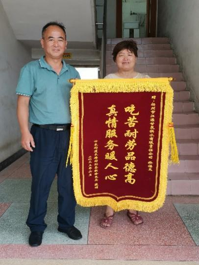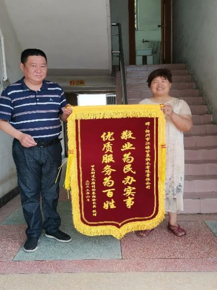 “真的非常感谢你们,高效服务、为民解忧,解决了我们家的用水问题!”近日,家住甘泉镇长塘村孙巷组的徐长英将一面印有“真情服务暖人心、吃苦耐劳品德高”的锦旗送到了长江水务江源公司甘泉分公司,感谢工作人员为她一家子解决了用水难题。
