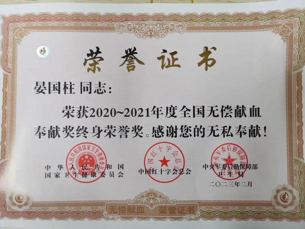 点滴热血,“输”写大爱。日前,供热公司“暖扬”服务队队长晏国柱同志被国家卫生健康委、中国红十字总会、中央军委后勤保障部卫生局联合授予“无偿献血奉献奖终身荣誉奖”。