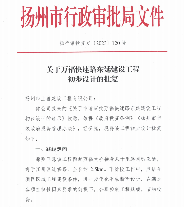 7月18日,万福快速路东延建设工程初步设计获得市行政审批局批复,标志该项目正式进入开工建设启动阶段。