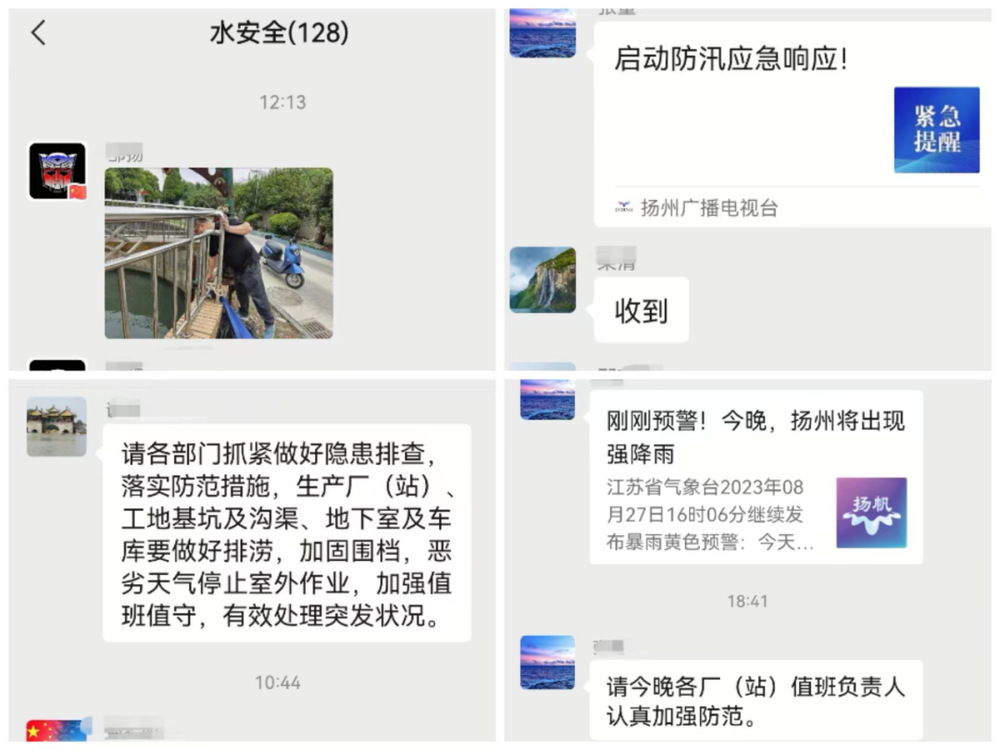 长江水务公司主要负责人和分管负责人连续在“中层管理”“水安全”微信工作群内发布暴雨预警,提醒加强防范,强化调度指令,层层落实安全生产责任。长江水务公司各生产、服务、抢修和施工部门启动应急预案,备足备齐防汛物资,24小时保持人员在岗值守,及时上报所在区域的雨情、汛情和应急处置的措施。