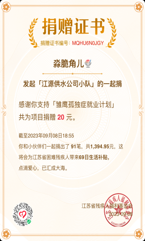9月8日上午,在长江水务江源公司各个办公微信群里接二连三地推送出一条条爱心捐赠链接,朋友圈里也都是倡议广大干部职工投入到捐款的行列中的内容。链接一经推出,大家纷纷拿起手机积极响应,5元、10元、20元金额不等,微信平台上爱心澎湃、暖流涌动。捐出一份爱心,奉献一片真情,职工们以实际行动支持了江源公司党支部与扬州市雏鹰儿童发展中心在99公益日“助力雏鹰孤独症就业计划”的活动。经过一上午的微信募捐,捐款人次91人,共计为雏鹰孤独症儿童筹得爱心善款1394.95元,这将会江苏省困难残疾人带来69日生活补贴。