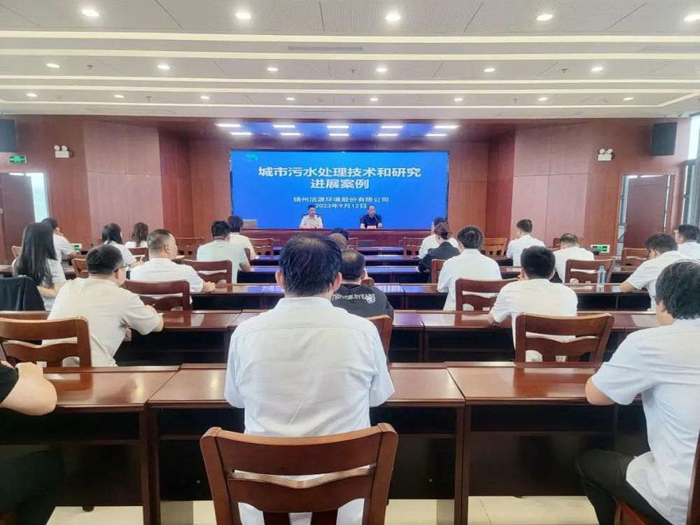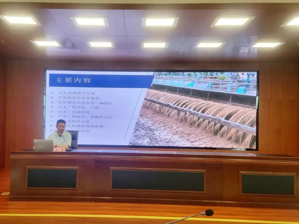 培训邀请了扬州大学环境科学与工程学院副院长、教授吴军进行授课。吴教授从厌氧氨氧化自养脱氮、好氧颗粒污泥技术 (AGS)、污水厂的节能, 产能、污水厂资源回收、污水厂精细化,智能化运行、新污染物的去除、进水无机颗粒物的影响和溢流污染的控制等多个方面对污水处理技术进行了生动讲解,并为技术人员答疑解惑,现场研学氛围浓厚。