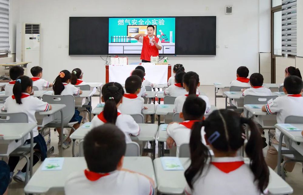 “如果家里天然气泄漏该怎么办?”“你们知道橡胶软管的使用期限吗?”为进一步提高小学生们安全意识,增强自护本领和避险自救能力,9月12日上午,扬州中燃公司党委与扬州汶河小学党总支共同启动“燃气安全进校园 守护扬州青少年”安全宣讲活动,为同学们开学送上燃气安全宣教“第一课”,借助同学们的“小手”把燃气安全知识带回家,以“小小宣传员”的身份带动家庭增强安全用气意识。