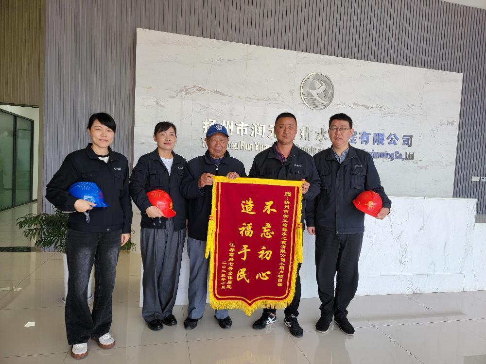 10月16日上午,江都南路7号6户居民代表满怀着感激之情,将印有“不忘初心,造福于民”字样的锦旗送到长江水务润元公司,表达对项目部接水工作的肯定和感谢。