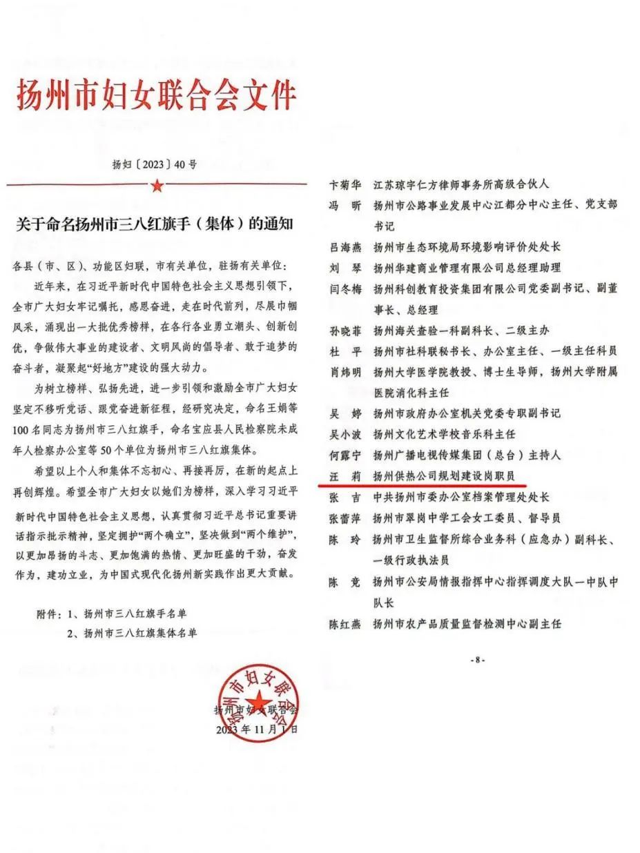 11月8日上午,扬州市妇女第八次代表大会开幕,开幕会上表彰了扬州市三八红旗手(集体)。供热公司总师办职员汪莉获得“扬州市三八红旗手”的荣誉称号。