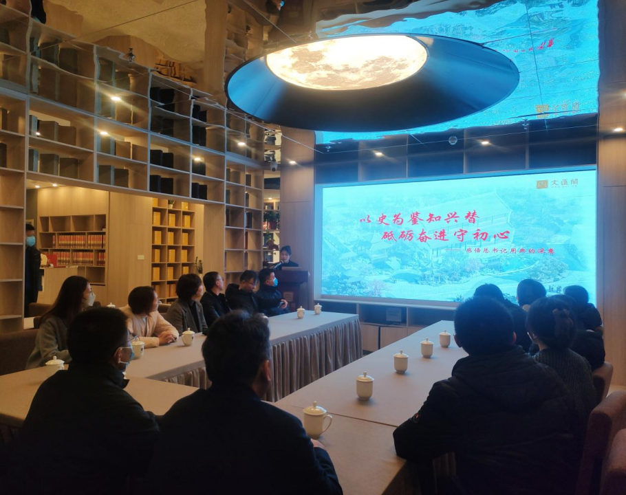 在讲解员的带领下,大家参观了一楼历史文化展陈区,通过“依靠学习,走向未来”主题学习平台,学习了“信念篇”“劝学篇”“修身篇”“齐家篇”“民本篇”“勤廉篇”六个篇章的相关内容,学习感悟习近平总书记在系列重要讲话中所引用的《四库全书》中的经典语句,深刻领悟习近平总书记关于党风廉政建设和反腐败斗争的重要论述。随后,文汇阁青年党员以《以史为鉴知兴替 砥砺奋进守初心》为题为大家上了一堂生动的专题党课。