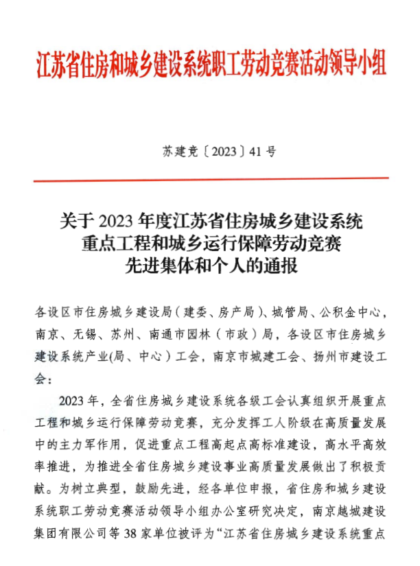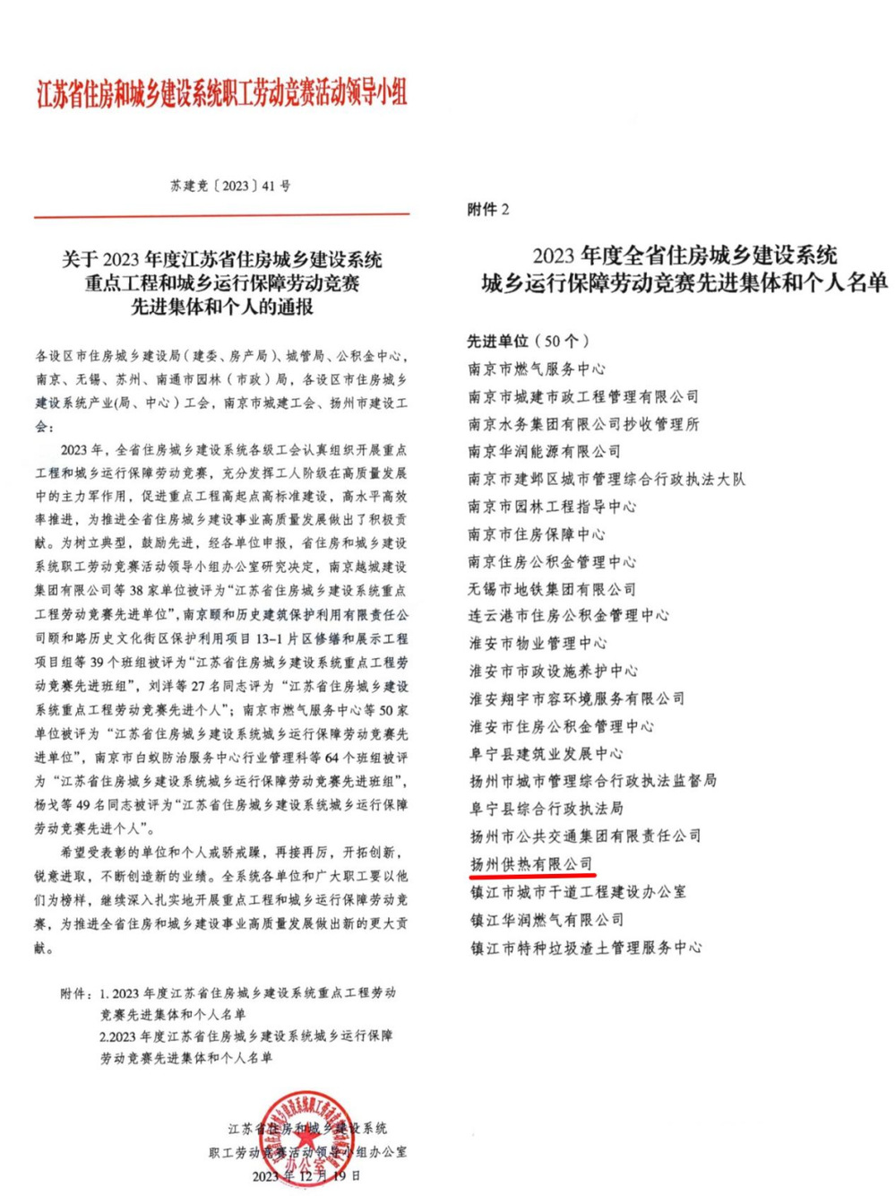 近日,江苏省住房城乡建设系统职工劳动竞赛活动领导小组发布《关于2023年度江苏省住房城乡建设系统重点工程和城乡运行保障劳动竞赛先进集体和个人的通报》,供热公司被授予“2023年度江苏省住房城乡建设系统城乡运行保障劳动竞赛先进单位”光荣称号。