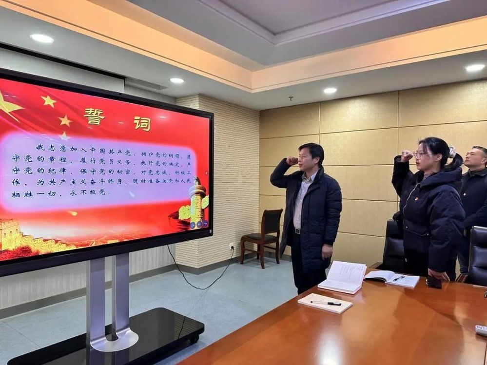 会议还讨论了预备党员转正事宜。新党员在支部书记的带领下,面对党旗,进行入党宣誓,全体党员重温了入党誓词。