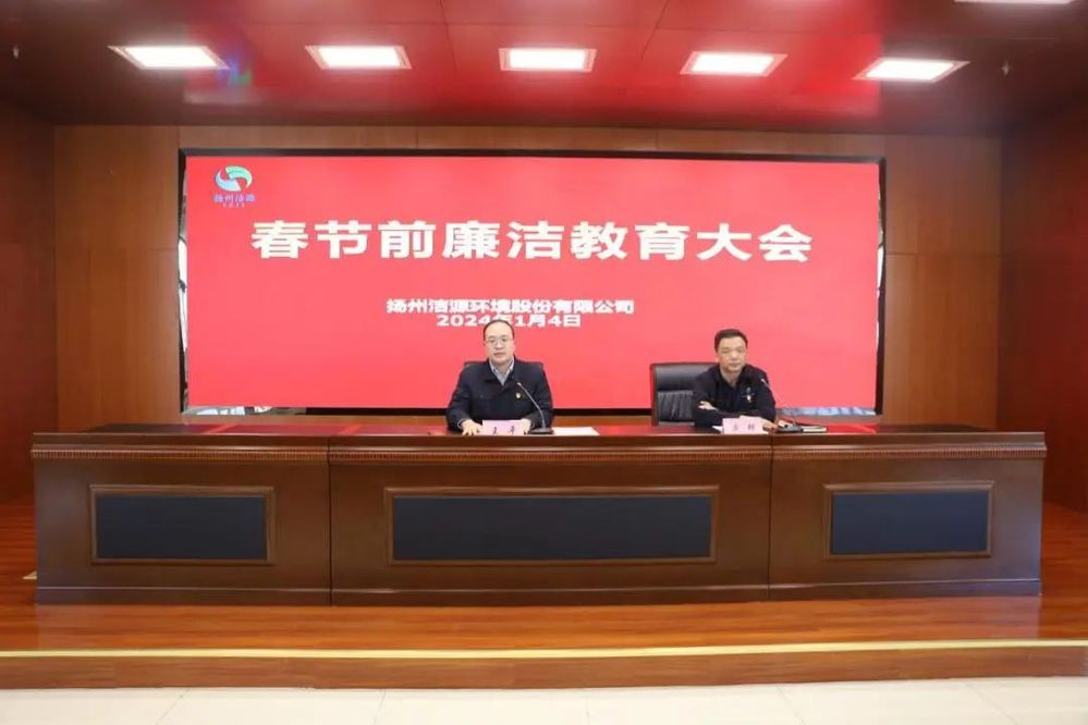 1月4日下午,洁源环境公司召开春节前廉洁教育大会,公司领导班子全体成员、全体中层干部及助理、重点岗位人员和供应商代表参加会议。