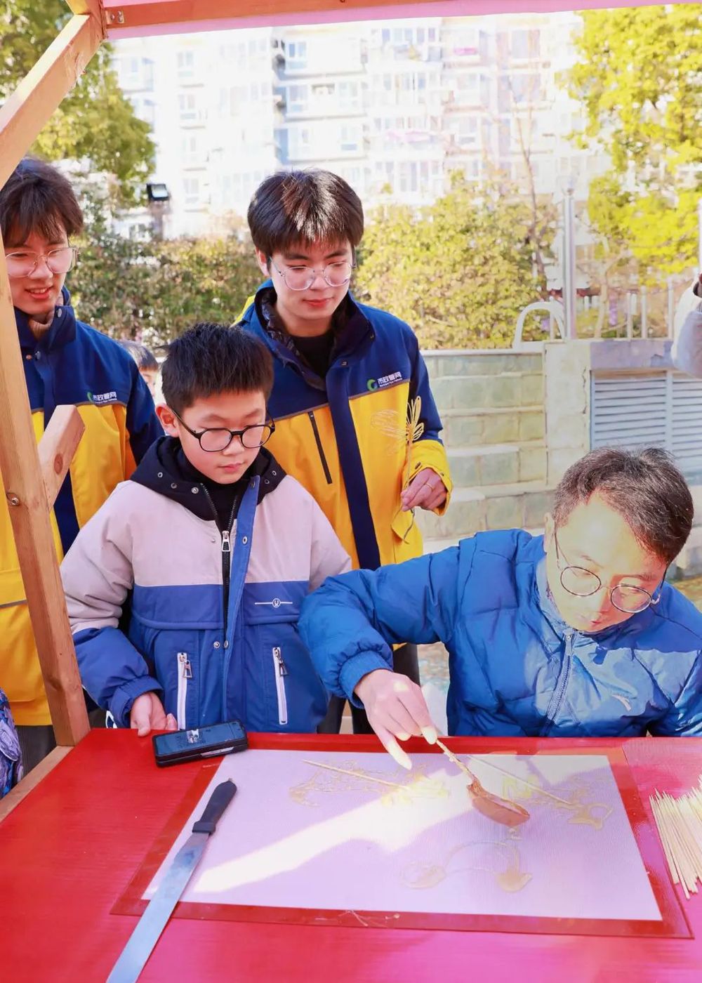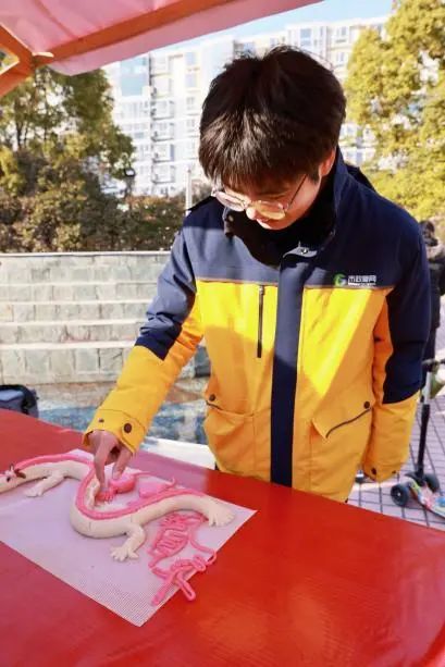 带着喜迎新春的喜悦,近日,890管网服务队的队员们联合石桥社区,在东方百合园小区广场参与了一场以“闹”“味”“趣”“爱”为主题的年蒸活动。本次活动通过互动体验的形式,将扬州的城市记忆重新唤醒,生动立体地展现在新时代的青少年面前,内容丰富饱满,韵味悠长。以“传统”与“现代”相结合,突出传统非遗技艺展示、传统文艺展演、传统手工艺、非遗美食、传统戏曲串烧等有机融入社区文化,品味城市烟火,营造传承中华优秀传统文化的浓厚氛围,促进了非遗与生活的融合互促。活动在热闹舞龙、划旱船等民俗表演中拉开帷幕。来自世界非遗的扬州面点大师教大家做年蒸,让大家在浓浓的年蒸蒸汽中闻到了年味。志愿者们认真观看,仔细聆听,跟着程序一步步制作不同形状的年蒸包子、龙型馒头,样子着实惹人喜爱。活动现场还有点红、剪窗花、吹糖人、糖画、写春联、送福字等传统习俗活动体验。另一边的滚铁环、套圈圈、丢沙包、投壶、猜灯谜等趣味活动更加受到小朋友的追捧。