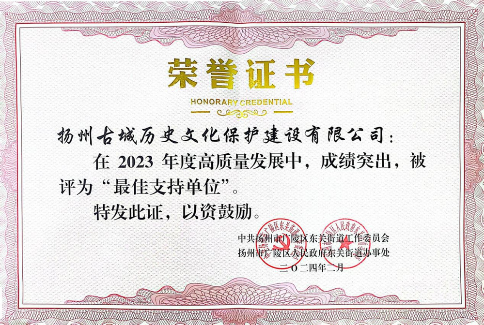 2月2日下午,广陵区东关街道召开2023年度总结表彰暨2024年基层治理现代推进大会,古城保护公司获得“最佳支持单位”荣誉。