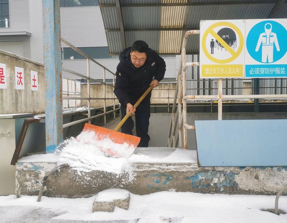 在三座污水处理厂,大伙两人一组、三人一队,齐心协力,不惧严寒,挥动着手里的铁锹、扫帚等工具,分工有序,默契配合,奋力铲除积雪,并在部分重要区域铺设了防滑草垫,经过两个多小时的奋战,原本积雪结冰、湿滑难行的道路变得干净畅通,厂区内部道路及露天池体楼梯变得安全畅通,不仅为职工生产操作和安全出行带来了便捷,更传递出一份关心与温暖。