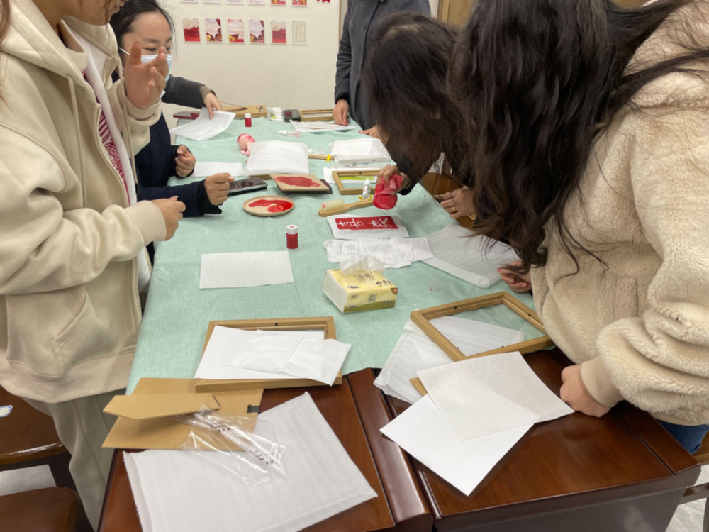 图片说明:在“送一份吉祥”环节,老师带领大家制作雕版印刷非遗文创。