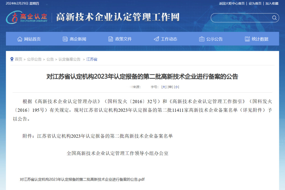 近日,全国高新技术企业认定管理工作领导小组办公室发布了《对江苏省认定机构2023年认定报备的第二批高新技术企业进行备案的公告》,管网公司下属扬州城控排水管网运维有限公司成功通过认定,并荣获“国家高新技术企业”。