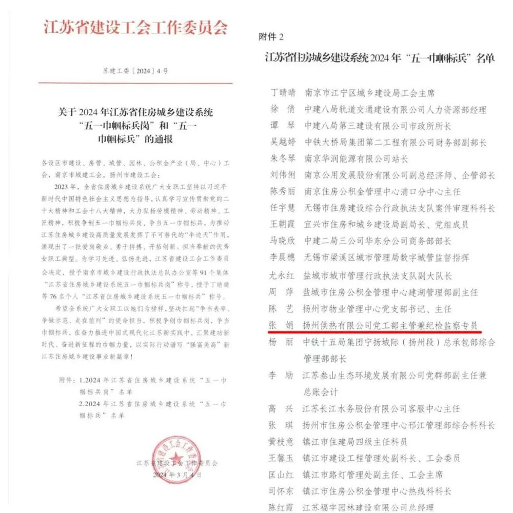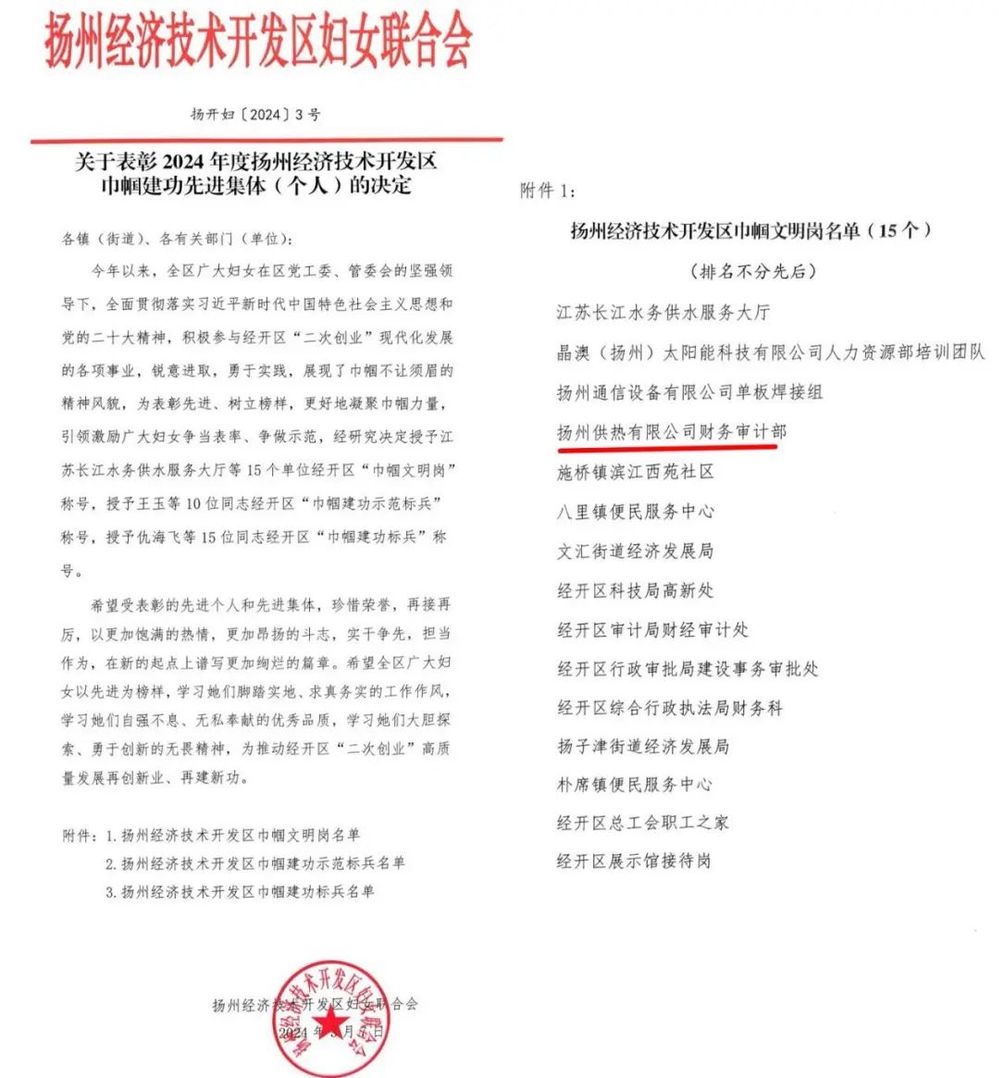 在第114个“三八”国际妇女节来临之际,供热公司多个女工集体和个人获表彰,党工部主管及纪检监察员张娟荣获“江苏省住房城乡建设系统五一巾帼标兵”称号,财务审计部荣获“扬州经济技术开发区巾帼文明岗”称号。