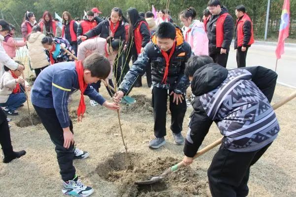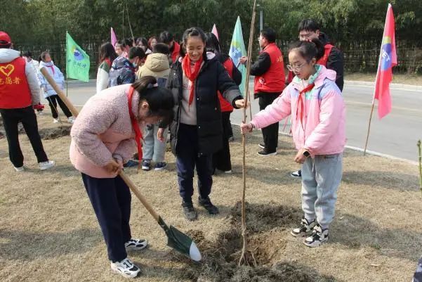 活动现场在志愿者的指导下,学生们分组进行植树。他们手持铁锹、水桶等工具,亲手挖坑、栽树、浇水,体验着劳动的乐趣和成就感。植树过程中,学生们不仅了解了植树的技巧和意义,更培养了他们的环保责任感和团队协作精神。