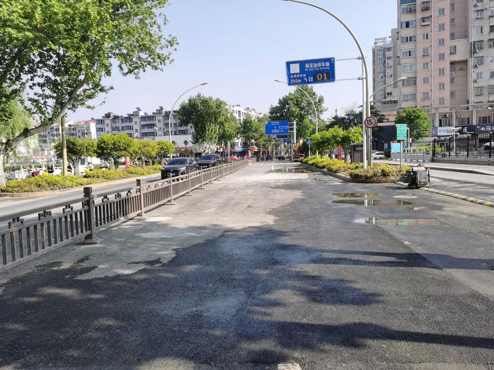 “给它放倒、给它放倒,扶住,抬稳……”4月26日夜里,原本从交叉口往南的大学南路施工围挡被拆除,施工人员正在对半幅道路铺设沥青。4月27日,大学南路半幅道路恢复通行!