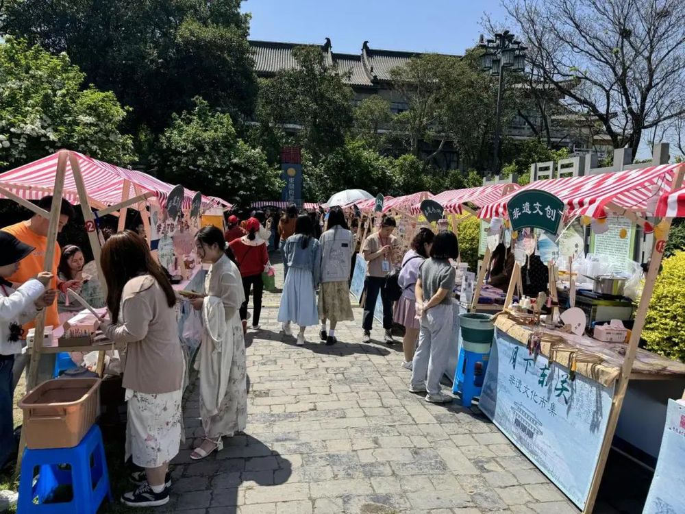 多彩活动,花式宠客。节日期间东关街在东门街遗址广场举办了“月下东关”非遗文创市集,该活动已于4月18日开始,在现场,各式各样的摊位琳琅满目,既有扬州刺绣、剪纸、葫芦刻画等非遗产品,也有各类特色小吃以及各种非遗节目演出,吸引了众多游客前来参与这场非遗文化的盛宴。同时,从5月1日起,街区还联合市文旅局,在东关街原三和四美厂区内举办了“烟花三月下扬州”文艺汇演活动,为游客夜游古城古街备足文艺大餐。