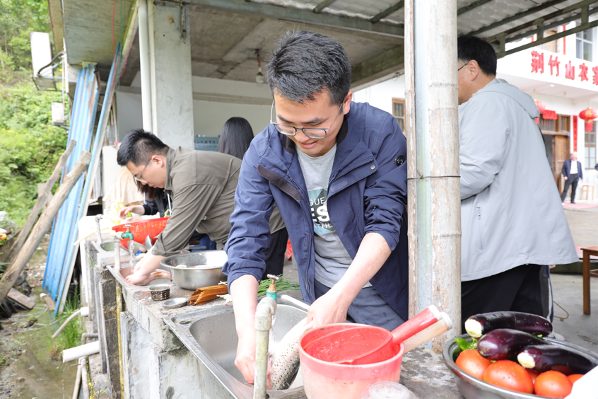 在红色拓展环节,全体学员前往毛泽东宣布“三大纪律”的荆竹山开展铁纪教育、穿越峡谷、抢救伤员、自做红军餐等团队挑战项目。制作红军餐时,学员们利用准备好的食材,大显身手,个个化身做饭能手。劈柴、生火、洗菜、择菜、切菜、摆盘,大家分工合作,每一个环节都配合默契,每一个步骤都井然有序。用着大锅灶,烧着柴火饭,一道道色香味俱全的佳肴被端上桌,得到了大家的一致好评。通过多个团队合作项目,既增强了学员们的团队协作能力,又展现了学员们朝气蓬勃的精神风貌和锐意进取的昂扬斗志。