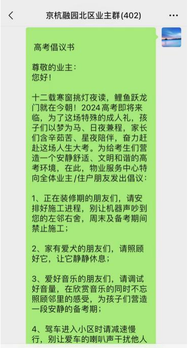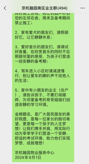 为给考生们创造一个良好的备考环境,物业管家通过业主群倡议以及线下宣传的方式,广泛倡议业主们在考生备考倒计时和考试期间尽量停止大声喧哗、车辆鸣笛、装修等一切容易对考生造成干扰的行为。