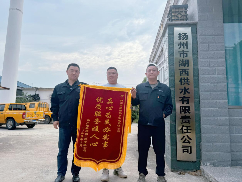 近日,江苏顺泰交通电子有限公司带着一面精心制作的锦旗来到长江水务湖西公司,为了表达对一站式供水服务接水速度快的感激之情。这面锦旗不仅是对湖西供水卓越服务的认可,更是对双方长期合作关系的坚定信心。