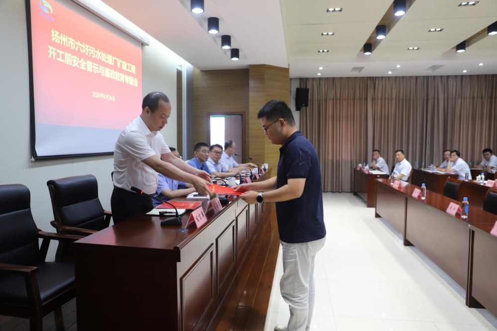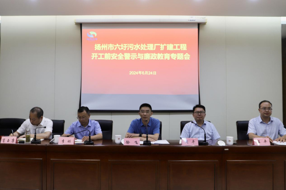 为确保六圩污水处理厂扩建工程顺利开工建设,做好工程建设期间的廉政工作,打造优质工程与廉洁工程,6月24日下午扬州洁源环境股份有限公司召开一期安全警示与廉政教育专题会。城控集团党委副书记徐飞、副总经理周平、企管部副部长李刚、洁源环境公司领导班子成员、驻项目安全管理人员、参建单位分管负责人和项目安全管理人员参会。